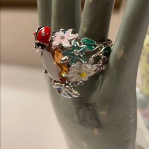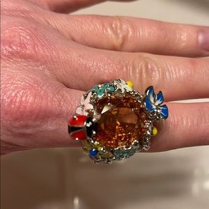 Stunning and bold ring! It truly is like a work of art. Beautiful enamel flowers, a ladybug, and butterfly all adorn this ring. The ring itself is made of a rhodium plate over metal alloy. Definitely a statement piece! It fits on my size 8 finger, but is a tiny bit loose.