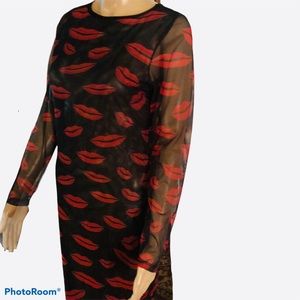 NWT. Semi sheer with a semi sheer liner. Long sleeves. Crew neck. Black with red lip prints. Stretchy fit. 17” pit to pit x 42” long. Size says large but listing as small. Runs very small