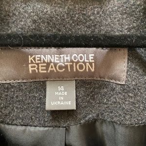 Kenneth Cole Reaction over/trench coat. Three button closure, black buttons, flattering pockets set more towards the hip, back faux belt. Coat is lined. Excellent condition.