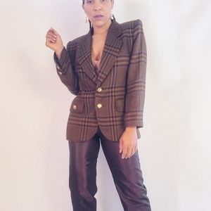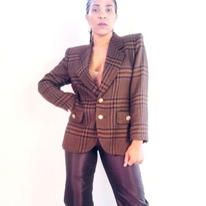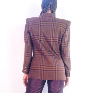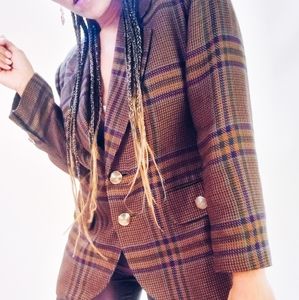 Long sleeve textured multicolored blazer with gold button detailing. Two button front closure. Pockets. Lined. Shoulder padding inside lining.