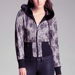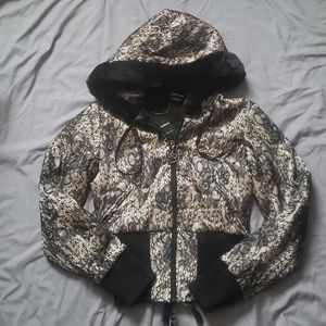 NWT Rare Limited Edition Bebe lace up corset bonded lace puffer jacket. Colors are nude cream and black. Lace up corset in the back and faux fur trim lining around the hood.