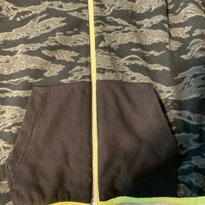 There is white paint stain on the black side of the jacket.