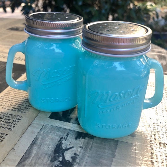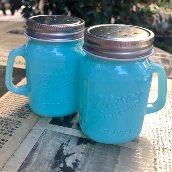 Farmhouse-style flavor for your table setting! Adorable miniature Mason Jars with screw-on lids & handles for easy use, boxed set of 2. 4oz shakers in durable & stain-resistant embossed milk glass, pastel blue. Vintage mason jar design... so cute and giftable: makes the perfect hostess gift for any occasion!