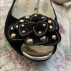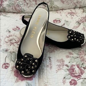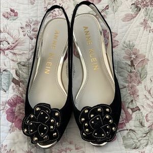 Darling comfortable open toe, slingback pumps. Soft black suede leather upper with gold studs on a multi-petaled flower. Brand new. Never worn. 1” lift on gold heels. 7M.
