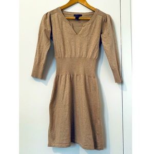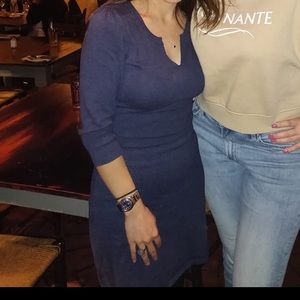 Cute knit beige dress. Crew neck with a subtle v in front. 3/4 sleeve. Waist cinching silhouette. Worn a couple of times, in perfect condition. Material and care tags were removed. Last pic how it looks in blue.