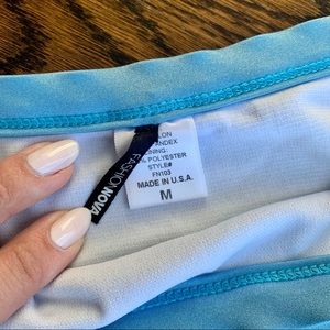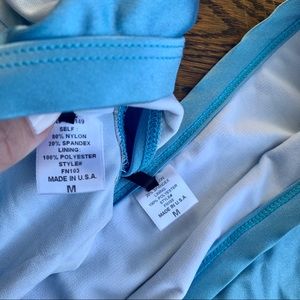 Sports bra fitted top, high waist bikini bottoms. Color is true to pictures, has a bit of sheen to it