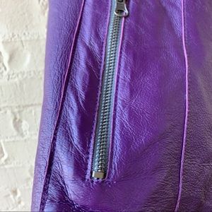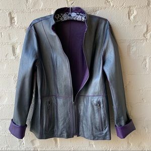 Deep purple leather (or high end faux leather?) jacket is reversible to dark silvery pewter. Beautiful tailoring with box piecing front and back and zippered pockets on both sides. No size shown but fits sizes 6-8 with sleeves that turn into wide cuffs providing perfect fit for any arm length. Originally priced in the multi hundreds.