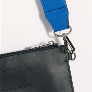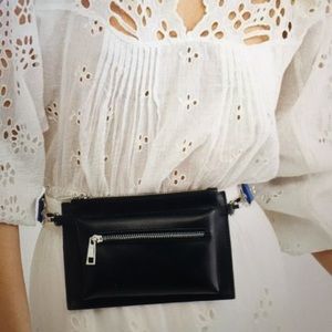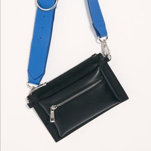 Bold leather belt bag featuring fun contrasting colors with a zippered buckle on the front and an O-ring buckle.