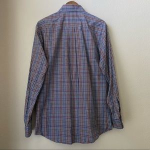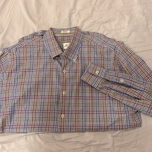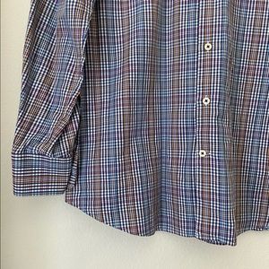 New! No signs of wear (never worn), and no flaws. The shirt is blue plaid with orange and pink accents. Color is most accurate in the first few photos in natural lighting.
