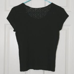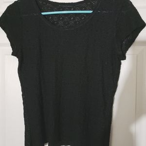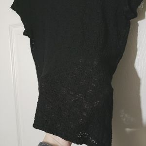 Info: Black textured see-through top. Size and care tags have been removed. Likely a size medium or small. Top of shoulder to bottom hem is 20", armpit to armpit is 16".