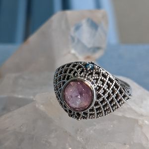 Natural Purple Amethyst & Blue Topaz .925 Silver Ring, size 8. A cross between Art Deco Style and Victorian the silver setting and shank are a basketweave work of art. There are two tiny Blue Topaz fairy secrets hidden where only you can see. It looks so delicate and intricate, but the workmanship and quality are top notch and solid. This ring is truly something special. Take the time to look at the photos.