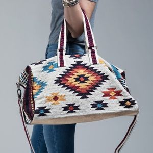 Brand New with tags!! This beautiful Handmade ethnic Navajo pattern travel tote bag is gorgeous! It has short straps and adjustable shoulder straps. It features two slip pockets and zipper pocket inside. fully lined cotton duffel bag