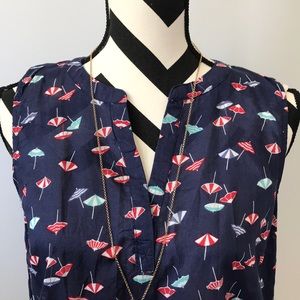 GAP Sleeveless Top. Super cute and beach ready! Navy with beach umbrellas throughout. V neck. Laying flat approx 25.5” shoulder to hem, approx 18.5” pit to pit. 100% cotton. Size XS. Excellent condition. #1469