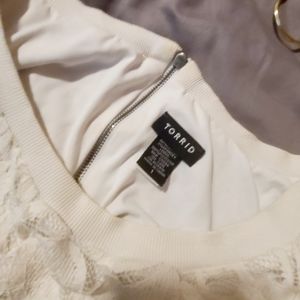 Torrid white lace popover top with back zip. Sleeves are sheer lace and body has a full lining. Torrid Size 1 (XL).