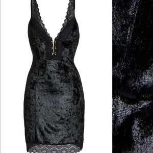 Gorgeous! This velvet minidress makes a statement with its precisely fitted silhouette and lace-trimmed bustier bodice.