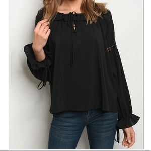 Black Ruffle Detail Tunic Top. Super cute wardrobe staple. Ruffle, with a tie neckline. Ruffling at the sleeves. Flowy style. Relaxed fit. I am modeling size Small. 100% polyester. #BE6