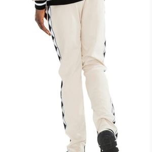 Khaki/tan Diamond Tape track suit with black diamond design down side 95%polyester and 5% spandex full zip track track jacket with pants. Dual strip cuff and waist. Color is similar to a cream or light tan but called khaki.