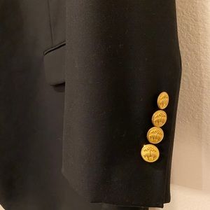 Brand new! Never worn. It’s a jet black suit jacket with gold buttons along the front and the cuffs. The buttons are very nice and detailed - see photos. There are several pockets on the front and on the interior for easy storage. Very high quality!