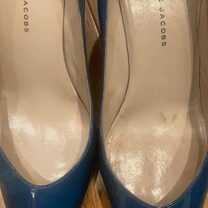 These shiny Marc by Marc Jacobs heels are a great compliment to a chic outfit! They are a greenish blue color. As you can see in the photo, the heel is about 3 inches in height. I’ve photographed slight (greenish) discoloration on the upper back of the ankle of the shoe, and also a few tiny breaks or snags in the patent leather. European size 40 1/2. Made in Italy.