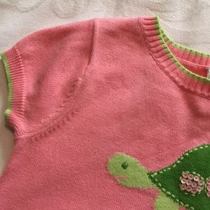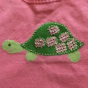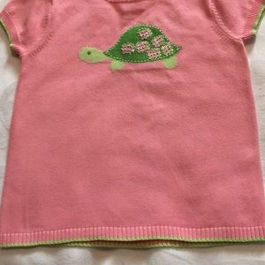One of the cutest vintage Gymboree tops ever! This lightweight pink short sleeved sweater has a large turtle in the center with pink sequin accents. The bottom of the sweater, the bottom of each sleeve, and the neckline is trimmed in lime green to match the turtle feet & head. It is in excellent used condition. I do have the coordinating pants listed as well. Size 3. If you want to purchase more than 1 item be sure to click the bundle link in each listing & pay only one shipping fee. Smoke free.