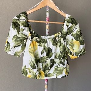 NWT H&M Cotton Puff-sleeved Short Crop Top in Lemon-print. Sizes XS, S M, L & XL.
