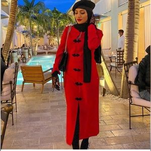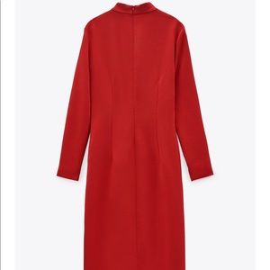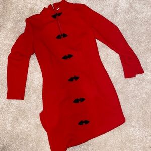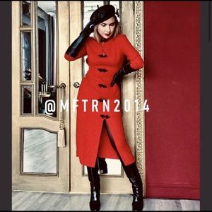 Long sleeve midi dress with high collar with opening. Front slit at hem, contrasting toggle detail. So pretty with black gloves:)!