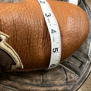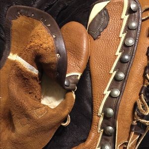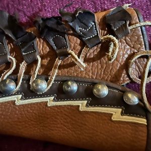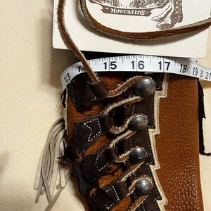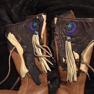 These amazing moccasins are handmade from Butter soft bronze Buffalo with Deer hide trimmings in light & dark shades of brown. decorated with purple half moon and blue star design along with a sterling Silver & turquoise medallion w fringed cream leather tassel at the rear. Size 8 wide footbed lined inside w sheepskin/outside sole is rubber for long lasting wear. Fasten with adjustable leather laces/Indian head/Buffalo nickles allows for different calf sizes. I wore them only a few times.