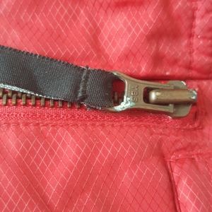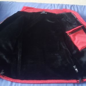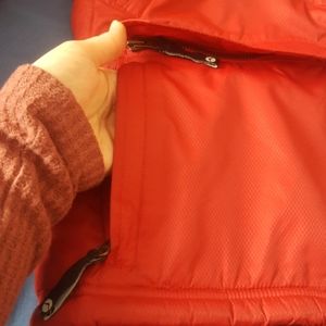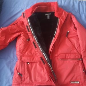 American Eagle faux fur lined heavy-duty winter coat in a vibrant red. Has 11 functional pockets, removable and adjustable hood, and two side velcro/zipper openings for ventilation or reaching inside the coat without having to unzip the front. Dual velcro and zipper closure in the front as well. Turtle neck like ribbing at the neck. Some slight tarnishing of a few of the zippers, and a few darkened spots are the only signs of wear I this otherwise like new coat.