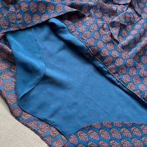 Eye-catching teal and blood red orange colors in a geometric floral pattern. Sleeveless, collar with vertical ruffle that has upper buttons. Front Hem is straight across while the back is curved, giving a tucked in look.