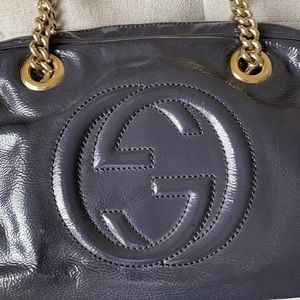 Gucci Patent Leather Soho Disco Chain bag in good conditon . Interior has yellowing . GG logo in the front . Gold hardware . Tassel detail . No ripped . Signs of use and slight wears . Comes with dustbag . Please check and zoom the photos for more details .