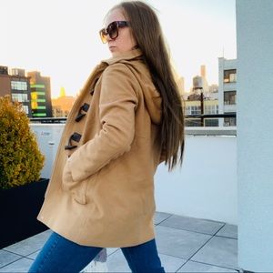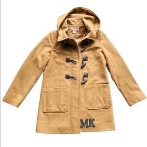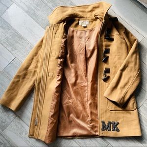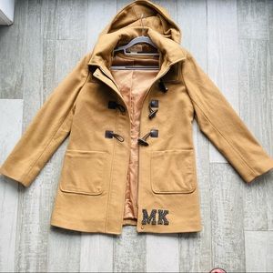 Michael Kors Wool Camel Removable Hood Royal army Toggle Duffle buttons Wool Coat Camel color pea coat with Toggle duffle frayed wood styled buttons accents, Snow proof winter, removable zipped hood, black duffle buttons wood simulated & black leather hooks.