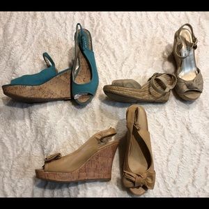 Three pairs of adorable summer wedges. These are all in excellent used condition. They are very comfortable and easy to walk in because of the wedge style heel. Perfect for any summer wardrobe.