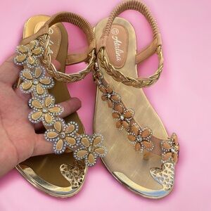 This thong sandal is great to dress up, or dress down; day to night The soft elastic slingback keeps your foot secure & comfortable This sandal is embellished w/ neutral flowers, silver rhinestones, a gold plated design at inner toes & a gold braid. The insole is purposefully brushed w/ metallic gold strokes. All materials are faux leather & this sandal runs true to size Italina Floral Rhinestone Thong Flat Sandal