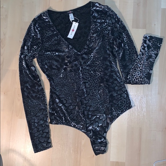 deep v-neck - long, fitted sleeves - two-tone iridescent semi-sheer print with a velvety feel - thong back - snap closure at gusset - fits true to size