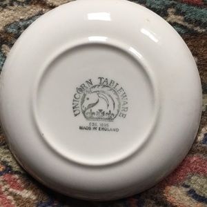 Blue white unicorn tableware England of Windsor castle adaptive use for feeding or watering birds or reptiles or any other cats pets imperfections in pottery do not effect use
