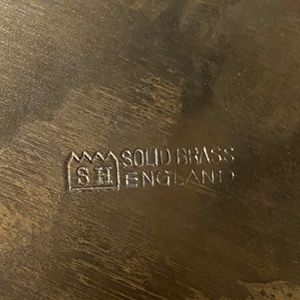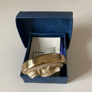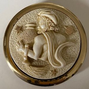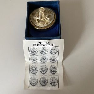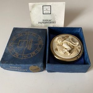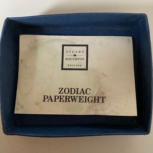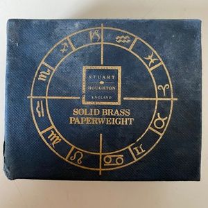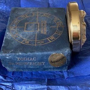 This is a solid brass zodiac paperweight by Stuart Houghton, made in England, sign Aquarius (late-January thru mid-February birthdays). It is in used condition as can be seen, however it is in its original box with all original literature and pretty blue tissue paper. You can see around the bottom rim of the brass, there is some spotting/wear (5-7 o'clock-ish & a little bit around the top left, 10 o'clock-ish). The carved Aquarius is very clean/white. Box's condition can be seen in photos.