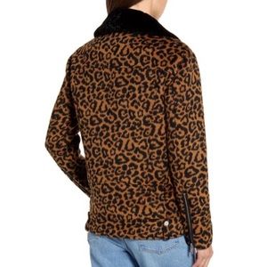 Avec Les Filles Leopard Print Wool Jacket with Faux Shearling Collar. Classic moto jacket in leopard-printed wool with a detachable collar of plush faux shearling. Features Asymmetrical front-zip closure, Notched lapels, Zip cuffs, Chest zip pocket; front zip pockets and snap-flap pocket. Lined.