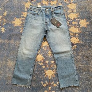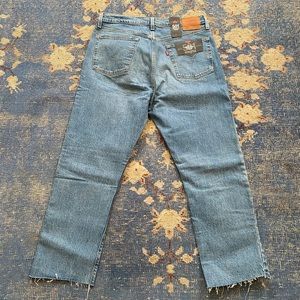 Straight leg jeans constructed with premium stretch denim, 5 pocket styling, and a cut-off raw hem. 99% cotton and 1% elastane. 26" inseam. New with tags.