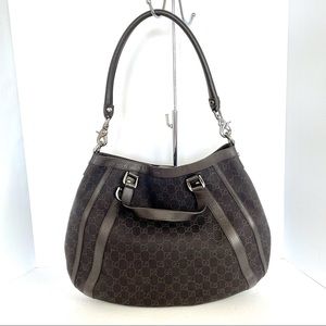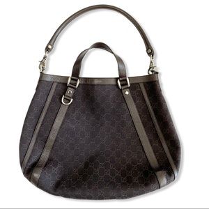 We guarantee this is a 100% authentic GUCCI Monogram Medium Abbey Convertible Tote Dark Brown. This chic tote is crafted of brown Gucci GG monogram canvas. For versatility, a detachable rolled leather shoulder strap is included. The top of the bag is open to a black fabric interior with a zipper pocket. Preloved In Excellent condition.