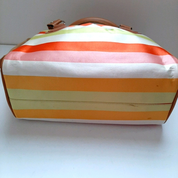 Super pretty colorful glossy thick like satin fabric with multi color stripes handbag with sturdy faux leather top handle. NWOT. Fashion summer handbag with single spacious compartment perfect for traveling or everyday use that can fit all your daily essentials.