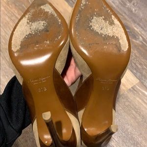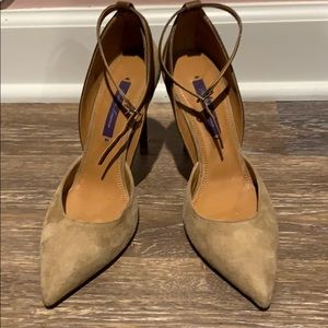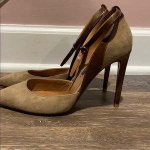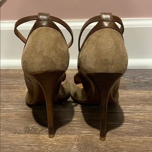 GORGEOUS Ralph Lauren Collection Stilettos MADE IN ITALY with beautiful Italian leathers (upper is camel color kid suede and heel is brown leather wrapped). Heel is 4” in height.
