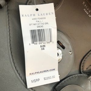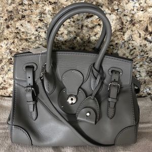 Authentic Ralph Lauren Collection Soft Ricky leather handbag in smoke grey, one of the brand's most beloved styles. Silver hardware, detachable crossbody strap and key for locked closure. Absolutely beautiful! Authenticity card and dust bag included. W 11”x H 8” x D 5.5”