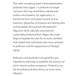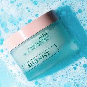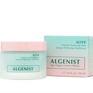 Algenist ALIVE Prebiotic Balancing Mask. A color-morphing mask with a prebiotic from algae + a probiotic to target concerns from unbalanced skin bacteria. On application, it transforms from mint green to pink & re-balances, detoxifies, & leaves skin alive & hydrated. Paired with patented Alguronic Acid, naturally-sourced & sustainably produced from Algae, this mask hydrates the skin for an even, clarified, & radiant look with skin resistant to pollution & aging. Brand new, never used, in box.