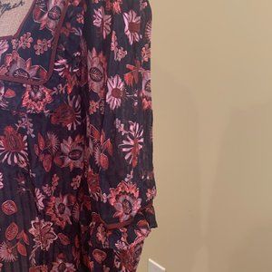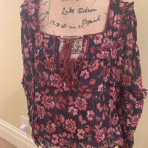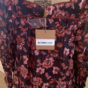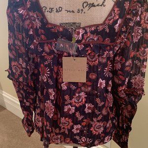 New with Tags - Steve May Brand Long Sleeve Blouse. Beautiful extra detailing ruffle trim on the shoulders and mid-arm length, tie front closure, square neck line. Rich colors of black, burgundy, pink, grey.