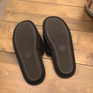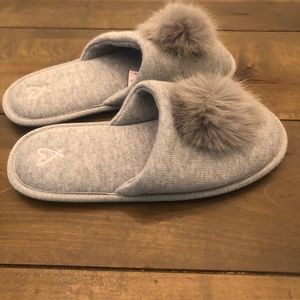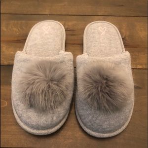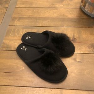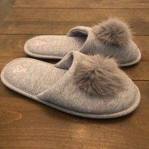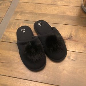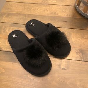 Faux fur pom pom bedroom slippers, size women’s large (9-10). Brand new, never worn. I love these but they are the wrong size. Available in grey or black. This listing is for one pair of slippers. Super comfy!!