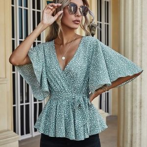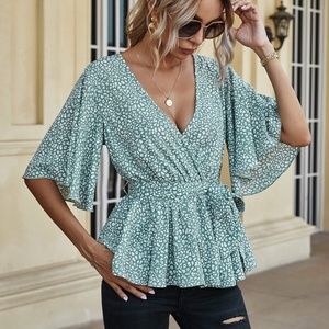 sage v neck dalmatian dot belted ruffle blouse