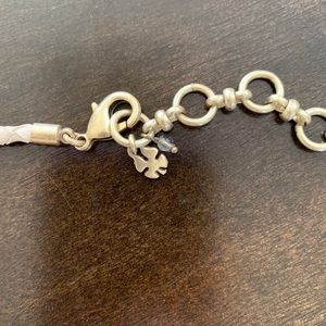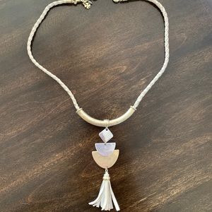 Fun mixed metal necklace - silver and gold with beige leather strap and fringe. Measures 20 inches at longest clasp setting.
