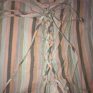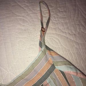 Gently worn. Needs a good steaming. Beautiful pastel stripes with pink lurex stripe fabric. Adjustable thin straps with rose gold hardware. Back laces up and is adjustable for fit.