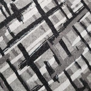 Heather gray top with white and black crossing line pattern throughout. Scoop neckline, 3/4 length long sleeves.