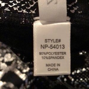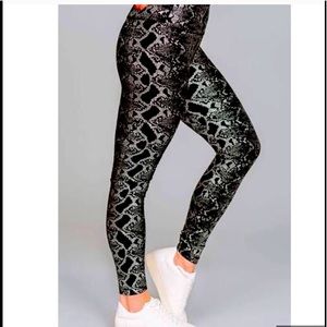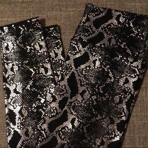 Snake print leggings/ very soft/ high waisted/ color is metal black/90% polyester 10% spandex/ medium thickness /not see threw/layered/ machine washable/approx/measures Inseam stretch to 38”waist stretch 16-17” Hips stretch to 20”